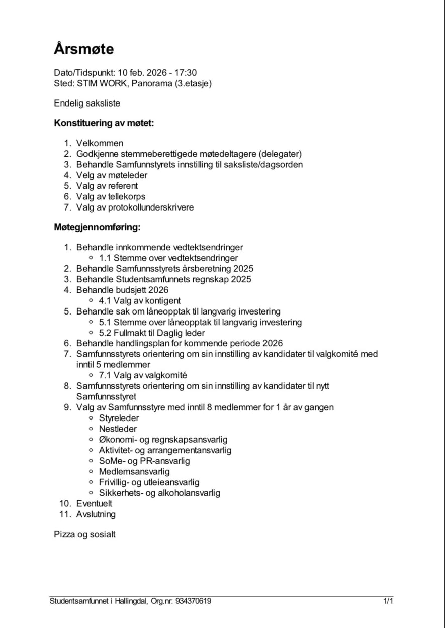 Årsmøte for Studentsamfunnet i Hallingdal. Saksliste og dagsorden er sent ut iht. vedtekter.