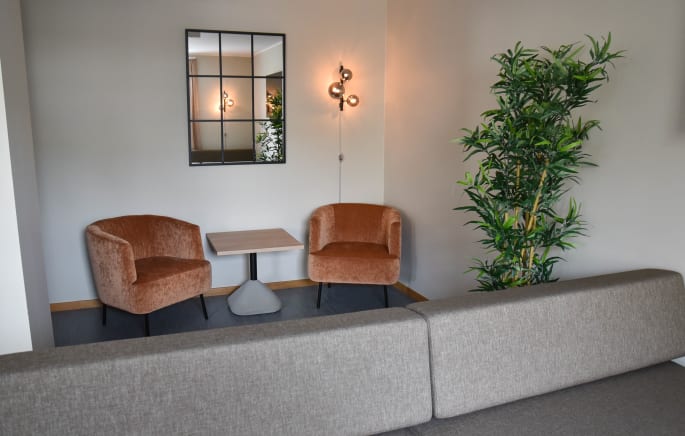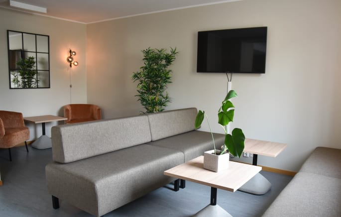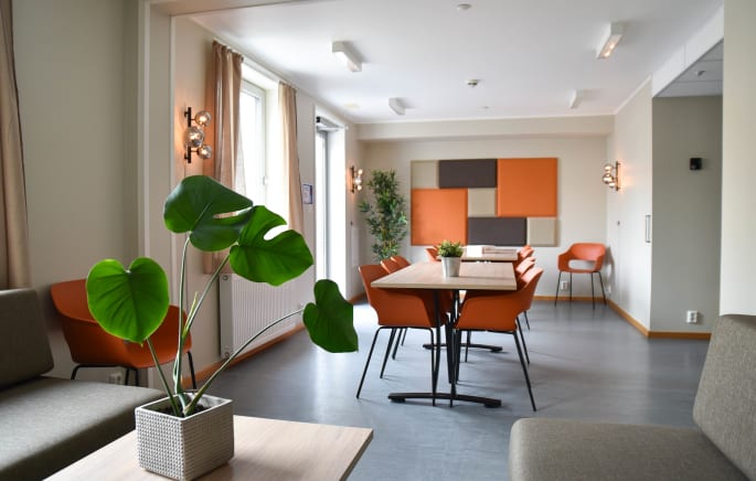 There is a newly renovated common room (2023) on the ground floor, which is available to all residents. Here there is a table with seating for about 14, as well as a sofa group, a large screen, two good chairs and a shelf with various board games. The room is at the very end of the hallway on the left. There is an exit to the back garden from the common room.