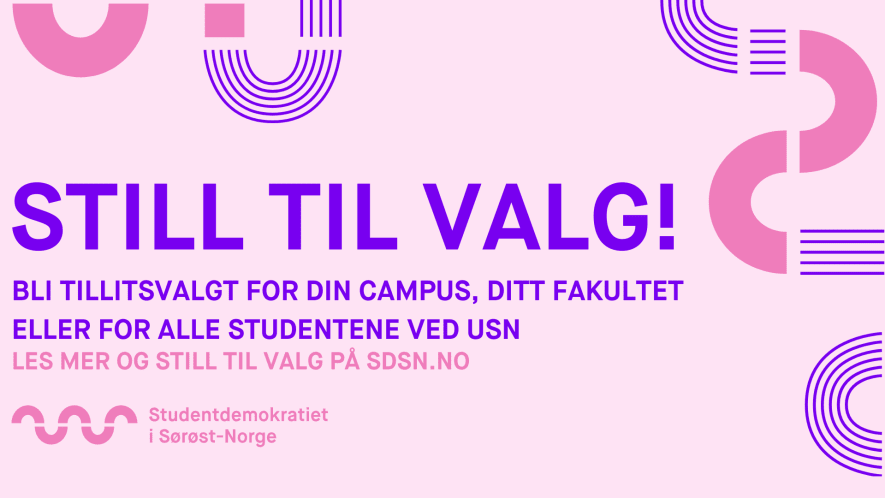 Er du student ved USN? Ønsker du å stille til valg? Fra 8. til 28. januar kan du stille til en rekke spennende verv i studentvalget! 🤩Her kan du lese om vervene du kan stille til: https://www.sdsn.no/Aktuelt/hvordan-kan-du-pavirke-studiehverdagen-ved-usn-1
