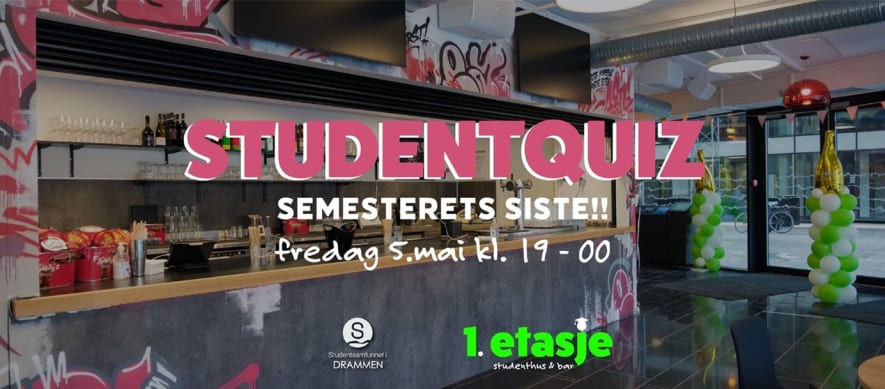 Fredag 5.mai på 1.etasje er det tid for semesterets SISTE quiz!! Baren åpner klokken 19, og quizstart er klokken 19.30! 🥳