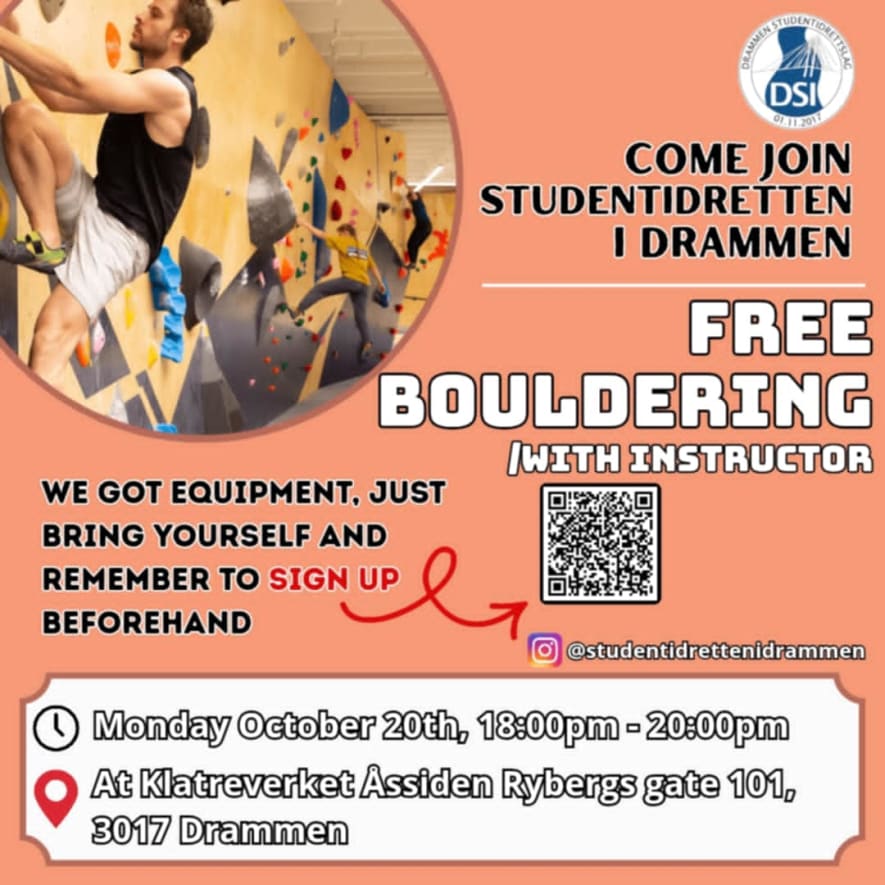 Studentidretten i Drammen, sammen med Klatreverket, arrangerer buldring for studentene ved USN Drammen. Arrangementet er gratis og utstyr blir ordnet av klatreverket. Du trenger ikke å ha noen erfaring med buldring for å være med her og vi har ordnet instruktør de tre første gangene. Det er bare å møte opp kl. 18:00 på Klatreverket Åssiden, Ingeniør Rybergs gate 101, 3027.