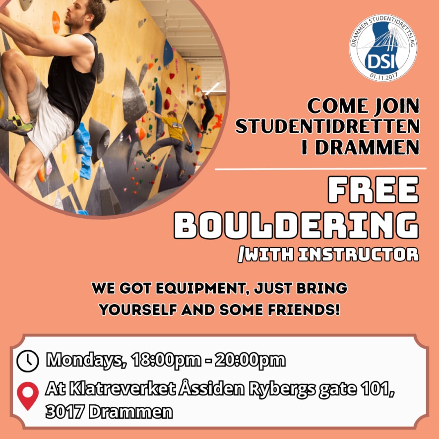Buldring på klatreverket på Åssiden. Dette er et gratis tilbud for studenter i Drammensområdet. Her blir alt av utstyr og klatringen dekt. Bare møt opp med godt humør.