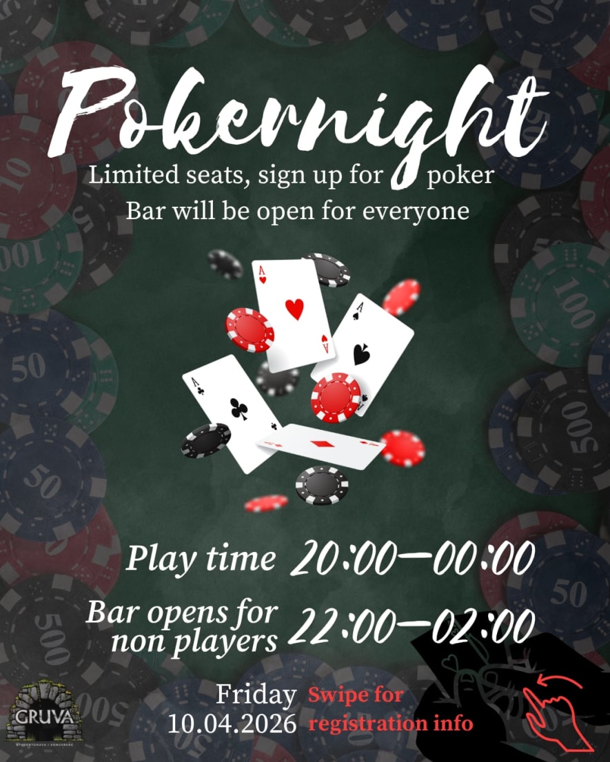 The 10th of april, the student society happily invites to a fun poker Night at Gruva !Spots are limited to 16, so be sure to sign up as soon as possible!