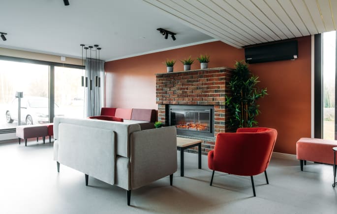På Grivi er det trivelig å bo! Du har ditt eget bad, deler kjøkken med seks andre, og har tilgang til det flotteste fellesrommet - med koselige sittegrupper, peis OG kinorom!